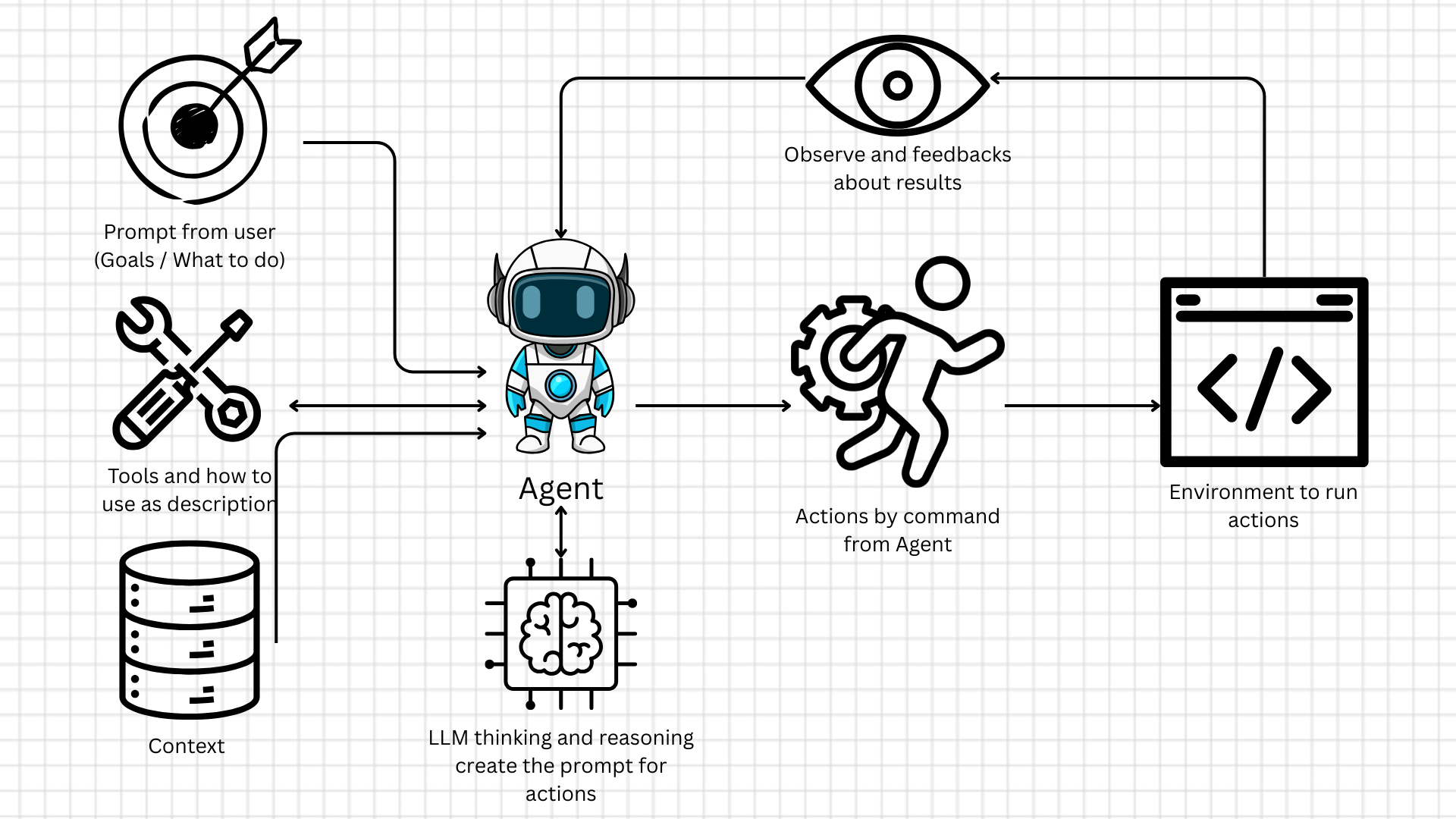 การทำงานของ Agent สามารถแบ่งได้ออกเป็น 3 ส่วนสำคัญได้แก่ Inputs, Core Processing, Action & Feedback และทั้งหมดนี้ทำงานเป็นลูปและเน้นที่การส่งข้อมูลไปมาหากัน (Data Flow)