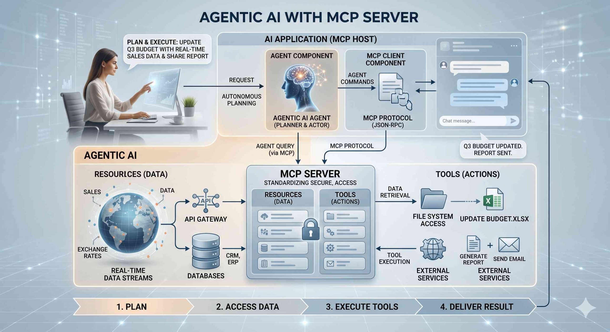 การนำ MCP มาใช้กับ AI Agent นั้นประโยชน์หลักคือเพื่อการสร้างมาตรฐานการรับส่งข้อมูลของ Agent กับ Environment ต่าง ๆ ไม่ว่าจะเป็นคอมพิวเตอร์ของเราเอง กับโปรแกรมอื่น กับระบบอื่นหรือกับ Agent ตัวอื่น ทั้งหมดเพื่อให้ Agent สื่อสารบนโปรโตคอลเดียวกัน มีวิธีการหยิบเครื่องมือ ทรัพยากร และทักษะ (Prompt) ไปใช้ในรูปแบบเดียวกัน ด้วยหลักการนี้ช่วยให้เราสามารถที่เพิ่มเครื่องมือ ข้อมูล คำสั่ง และจัดการได้อย่างมีประสิทธิภาพ