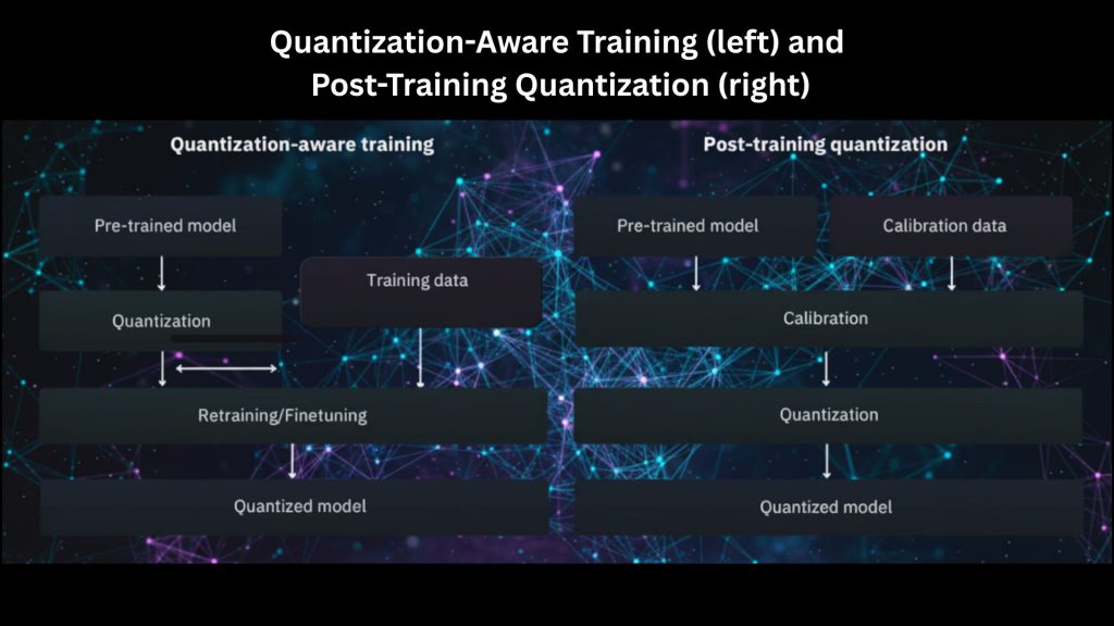 Quantization-aware training (QAT) แนวทางนี้จะผสานกระบวนการ Quantization เข้าไป ในระหว่าง ขั้นตอนการฝึกสอนโมเดล (training phase) เลย ซึ่งเป็นการปรับสภาพ (acclimatizing) ให้โมเดลคุ้นชินกับการทำงานภายใต้ข้อจำกัดด้านความแม่นยำที่ต่ำกว่า (lower precision constraints) การกำหนดข้อจำกัดของ Quantization ในระหว่างการฝึกสอนนี้ จะช่วยลดผลกระทบจากการแทนค่าด้วยบิตที่ลดลง (reduced bit representation) โดยเปิดโอกาสให้โมเดลได้เรียนรู้ที่จะชดเชย (compensate) ข้อผิดพลาดในการประมาณค่าที่อาจเกิดขึ้น นอกจากนี้ QAT ยังช่วยให้สามารถทำการ Fine-tuning กระบวนการ Quantization สำหรับเลเยอร์หรือองค์ประกอบที่เฉพาะเจาะจงได้อีกด้วย