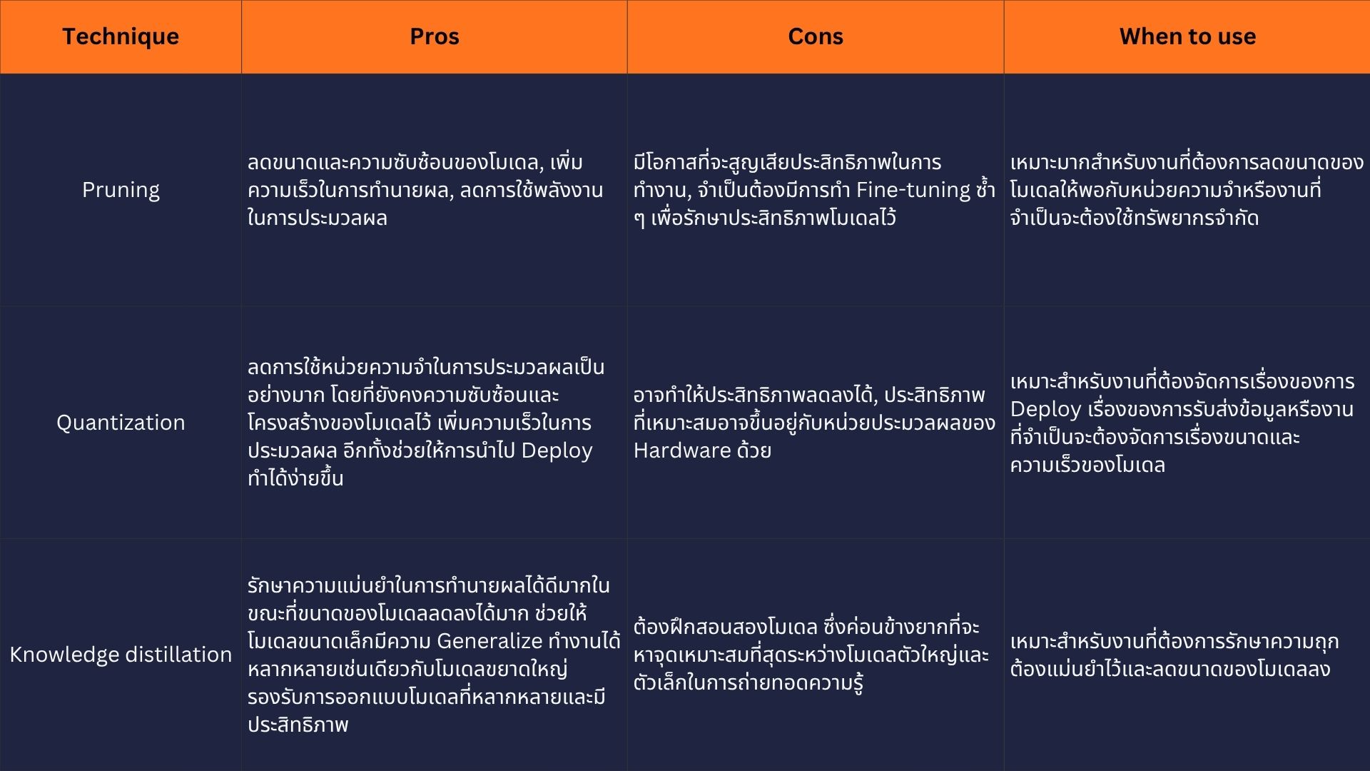 - Fine-tuning: ขั้นตอนนี้เป็นการฝึกสอนโมเดลใหม่อีกครั้งหลังจากลด Weights และนิวรอนออกไปแล้วเพื่อให้โมเดลที่มีขนาดเล้กลงนี้ยังคงประสิทธิภาพการทำงานเดิมไว้หรืออาจเพิ่มมากขึ้น แต่ทั้งนี้หากใน 2 ขั้นตอนแรกให้ผลลัพธ์ที่ดีมากพอแล้วก็ไม่จำเป็นต้องำขั้นตอนนี้ก็ได้